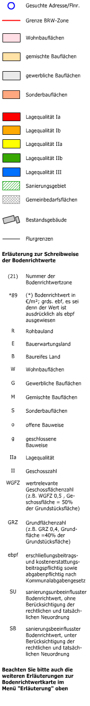 Nach einer Adress-Suche, oder einer Flurstücks-Suche oder einem Kartenklick in eine Zone wird hier der ermittelte Bodenrichtwert angezeigt. Bitte speichern Sie sich die abgefragten Daten im Anschluss als PDF ab!