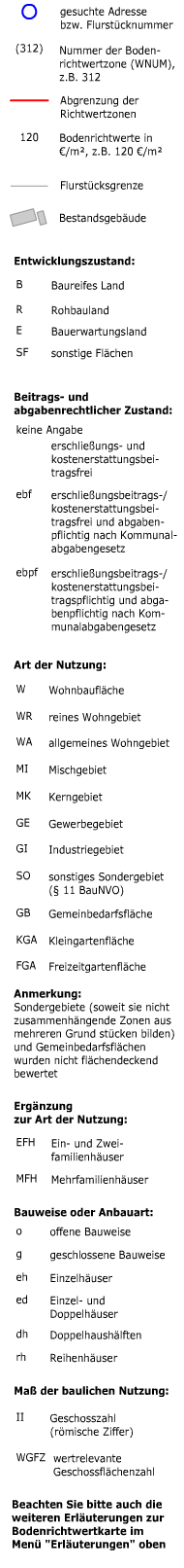 Nach einer Adress-Suche, oder einer Flurstücks-Suche oder einem Kartenklick in eine Zone wird hier der ermittelte Bodenrichtwert angezeigt. Bitte speichern Sie sich die abgefragten Daten im Anschluss als PDF ab!
