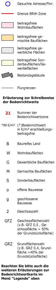Nach einer Adress-Suche, oder einer Flurstücks-Suche oder einem Kartenklick in eine Zone wird hier der ermittelte Bodenrichtwert angezeigt. Bitte speichern Sie sich die abgefragten Daten im Anschluss als PDF ab!