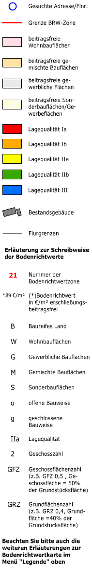 Nach einer Adress-Suche, oder einer Flurstücks-Suche oder einem Kartenklick in eine Zone wird hier der ermittelte Bodenrichtwert angezeigt. Bitte speichern Sie sich die abgefragten Daten im Anschluss als PDF ab!