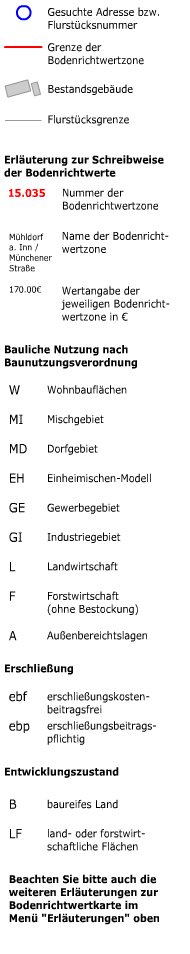 Nach einer Adress-Suche, oder einer Flurstücks-Suche oder einem Kartenklick in eine Zone wird hier der ermittelte Bodenrichtwert angezeigt. Bitte speichern Sie sich die abgefragten Daten im Anschluss als PDF ab!