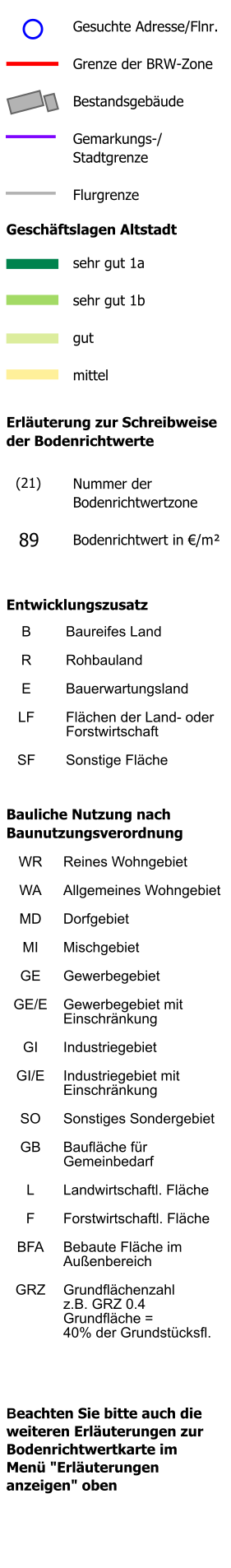 Nach einer Adress-Suche, oder einer Flurstücks-Suche oder einem Kartenklick in eine Zone wird hier der ermittelte Bodenrichtwert angezeigt. Bitte speichern Sie sich die abgefragten Daten im Anschluss als PDF ab!