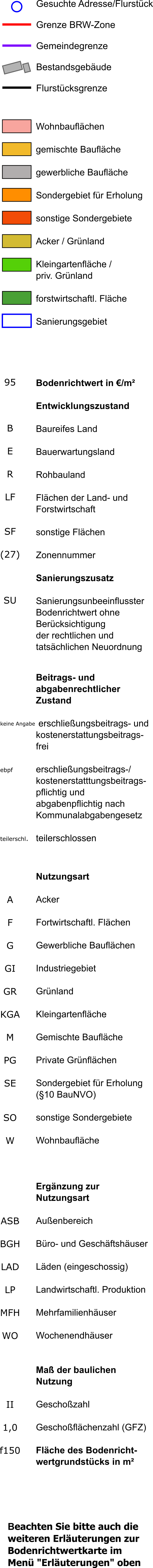 Nach einer Adress-Suche, oder einer Flurstücks-Suche oder einem Kartenklick in eine Zone wird hier der ermittelte Bodenrichtwert angezeigt. Bitte speichern Sie sich die abgefragten Daten im Anschluss als PDF ab!