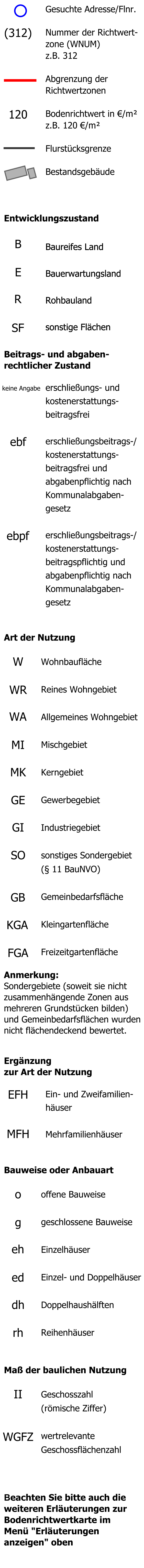 Nach einer Adress-Suche, oder einer Flurstücks-Suche oder einem Kartenklick in eine Zone wird hier der ermittelte Bodenrichtwert angezeigt. Bitte speichern Sie sich die abgefragten Daten im Anschluss als PDF ab!