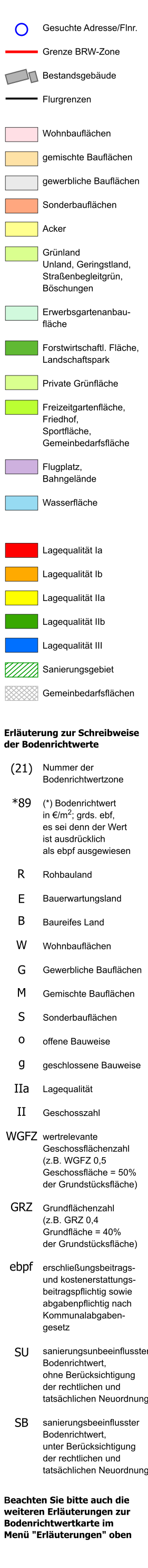 Nach einer Adress-Suche, oder einer Flurstücks-Suche oder einem Kartenklick in eine Zone wird hier der ermittelte Bodenrichtwert angezeigt. Bitte speichern Sie sich die abgefragten Daten im Anschluss als PDF ab!