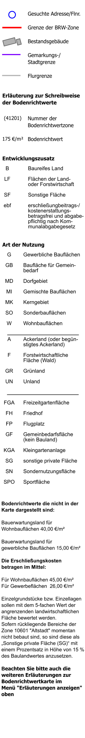 Nach einer Adress-Suche, oder einer Flurstücks-Suche oder einem Kartenklick in eine Zone wird hier der ermittelte Bodenrichtwert angezeigt. Bitte speichern Sie sich die abgefragten Daten im Anschluss als PDF ab!