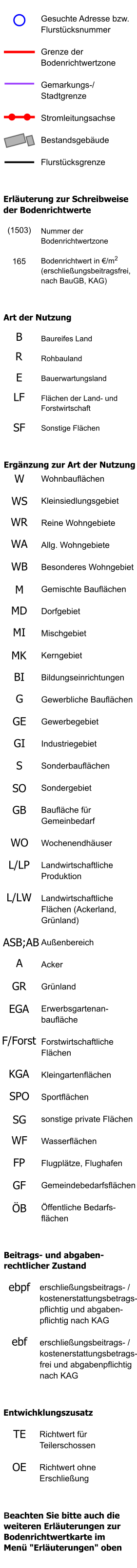Nach einer Adress-Suche, oder einer Flurstücks-Suche oder einem Kartenklick in eine Zone wird hier der ermittelte Bodenrichtwert angezeigt. Bitte speichern Sie sich die abgefragten Daten im Anschluss als PDF ab!