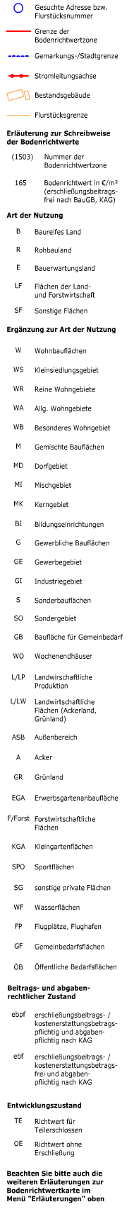 Nach einer Adress-Suche, oder einer Flurstücks-Suche oder einem Kartenklick in eine Zone wird hier der ermittelte Bodenrichtwert angezeigt. Bitte speichern Sie sich die abgefragten Daten im Anschluss als PDF ab!