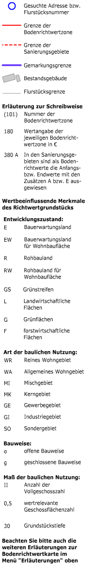 Nach einer Adress-Suche, oder einer Flurstücks-Suche oder einem Kartenklick in eine Zone wird hier der ermittelte Bodenrichtwert angezeigt. Bitte speichern Sie sich die abgefragten Daten im Anschluss als PDF ab!