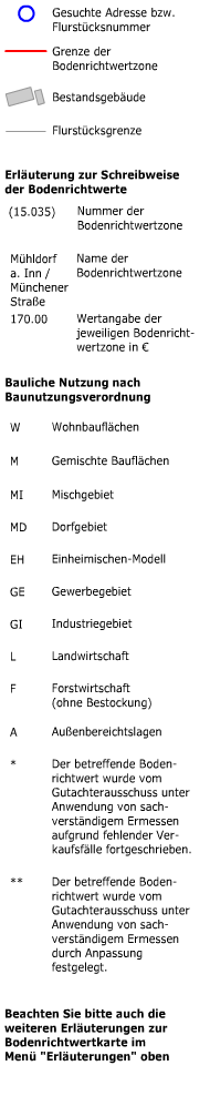 Nach einer Adress-Suche, oder einer Flurstücks-Suche oder einem Kartenklick in eine Zone wird hier der ermittelte Bodenrichtwert angezeigt. Bitte speichern Sie sich die abgefragten Daten im Anschluss als PDF ab!