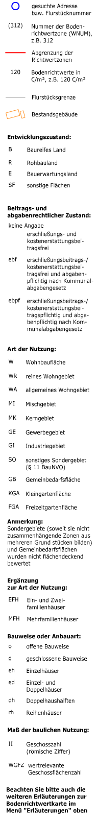 Nach einer Adress-Suche, oder einer Flurstücks-Suche oder einem Kartenklick in eine Zone wird hier der ermittelte Bodenrichtwert angezeigt. Bitte speichern Sie sich die abgefragten Daten im Anschluss als PDF ab!